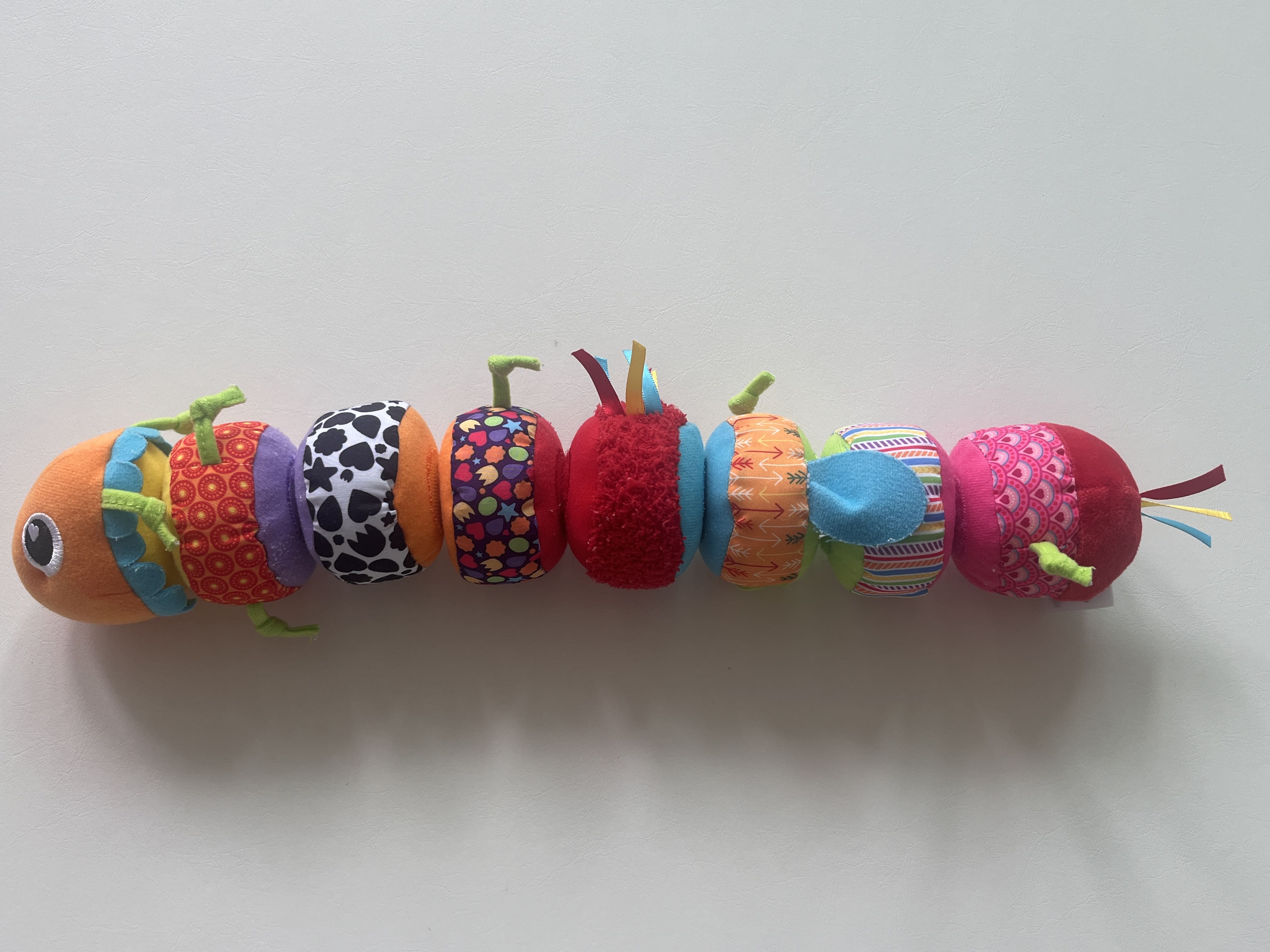 애벌레 몸통에는 다양한 촉감 자극이 들어 있고, 바스락거리는 소리나 뽁뽁 소리, 방울 소리도 있어서 감각 발달 장난감으로는 꽤 괜찮은 편이에요. 예전엔 머리 부분에서 음악이 나와서 세탁이 어려웠다고 들었는데, 제가 가진 건 리뉴얼된 버전인지 음악은 안 나오고 대신 가볍게 흔들면 방울 소리가 나요. 그래서 세탁도 어렵지 않았고 자주 빨아줬어요.