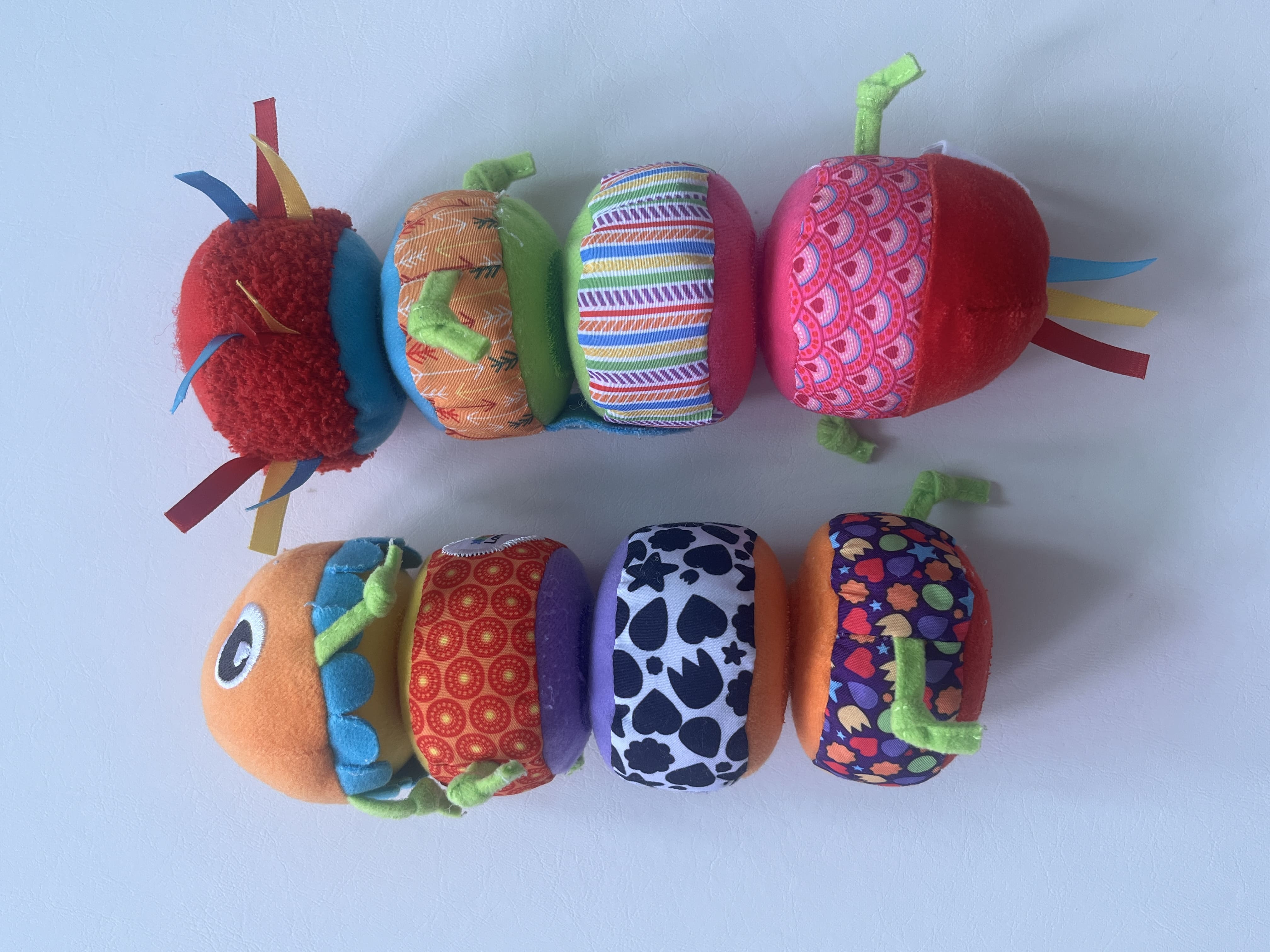 라마즈 애벌레는 생각보다 크고 길어요. 3개월쯤 처음 보여줬을 땐 아기가 손에 쥐기도 버거워했어요. 그래서 저는 애벌레를 반으로 나눠서 보여줬는데, 그렇게 하니까 확실히 더 편하게 가지고 놀더라고요.