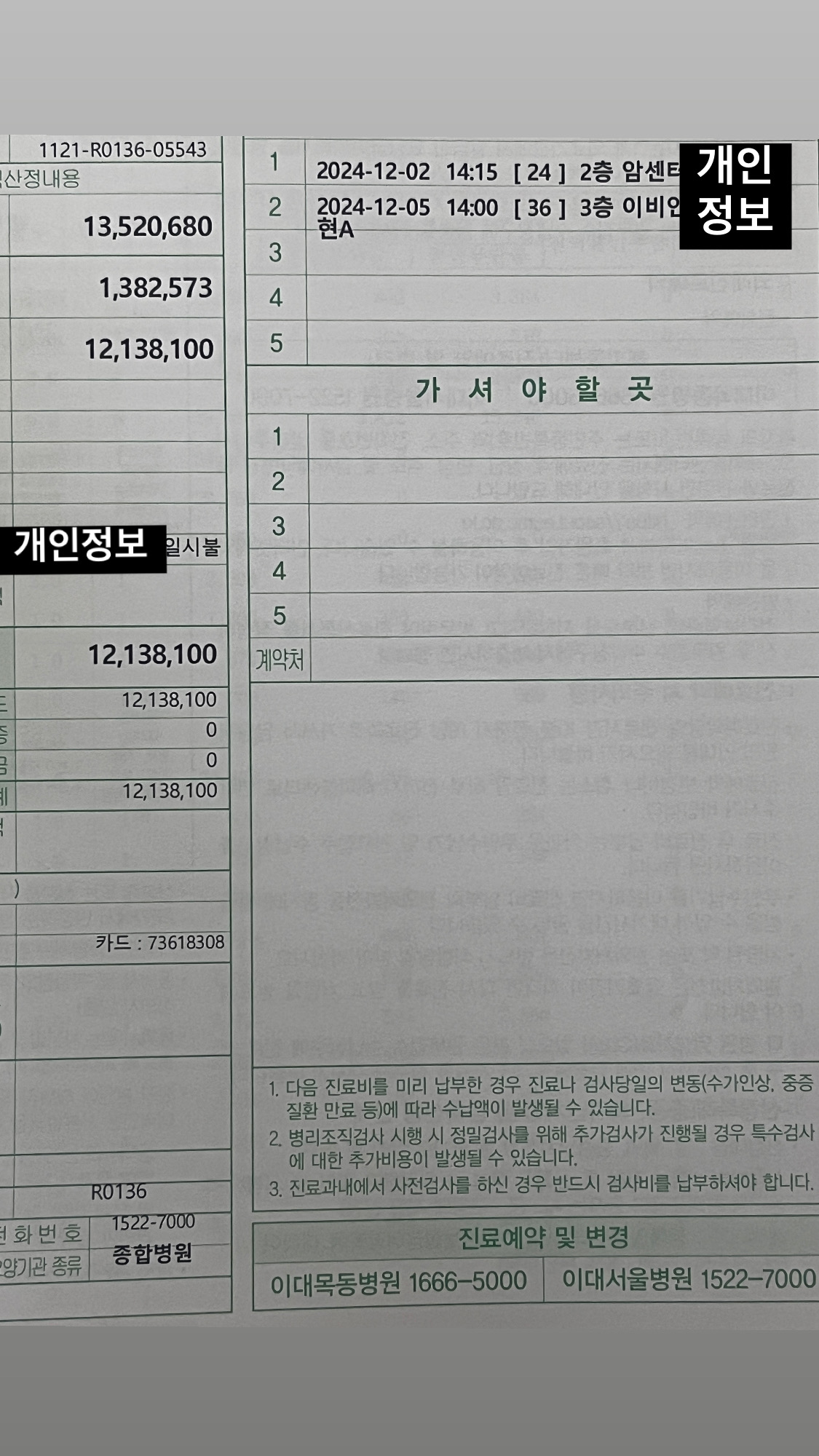 2박 3일 입원 포함 총 비용은 약 1,200만 원 조금 넘게 나왔습니다.
